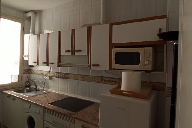La cocina está totalmente equipada con electrodomésticos como nevera, horno, lavadora, microondas, vitrocerámica, campana y lavavajillas, ofreciendo funcionalidad y comodidad.