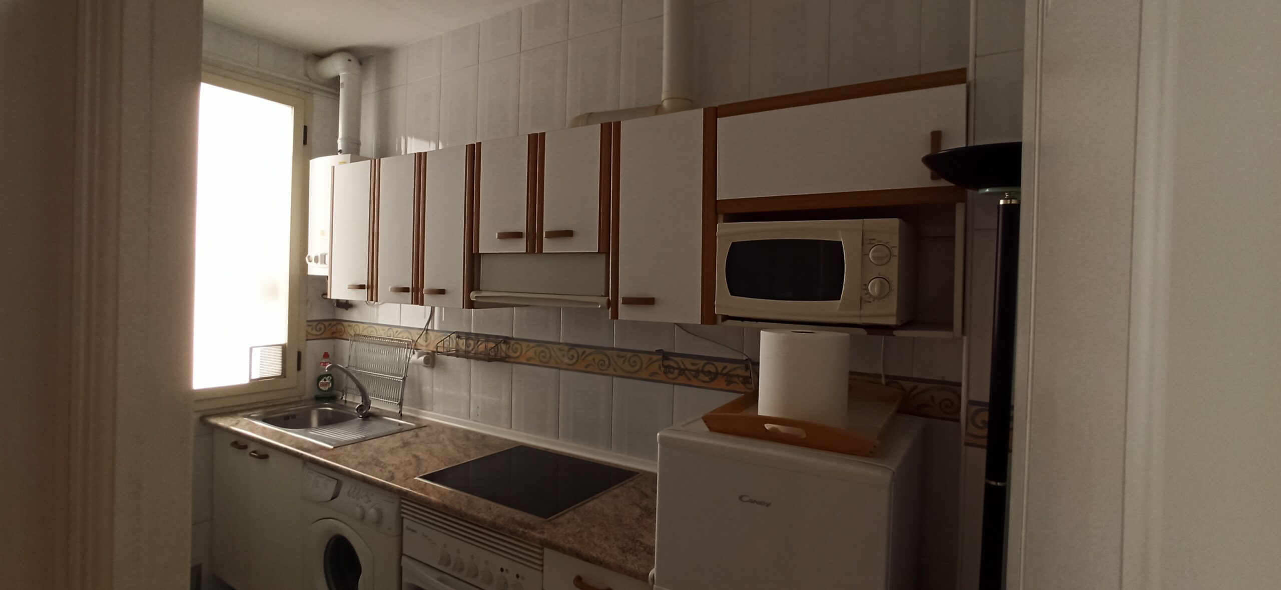 La cocina está totalmente equipada con electrodomésticos como nevera, horno, lavadora, microondas, vitrocerámica, campana y lavavajillas, ofreciendo funcionalidad y comodidad.